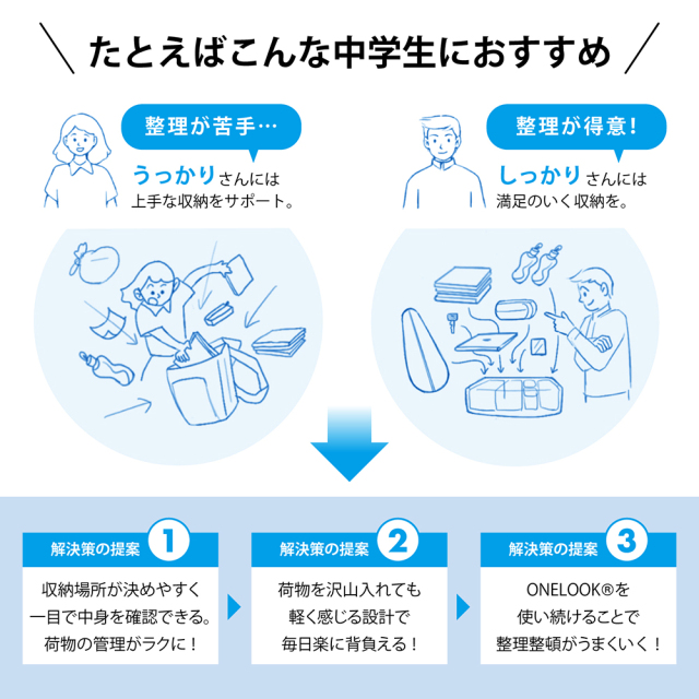 近年、中学生の持ち物はタブレット端末やノートPCの導入、教材の増加により荷物が増え、整理整頓の重要性がさらに高まっています。しかし実際には通学カバンの中がごちゃごちゃになり、「必要なものがすぐに見つからない」「取り出しにくい」といったストレスを感じる生徒も少なくありません。