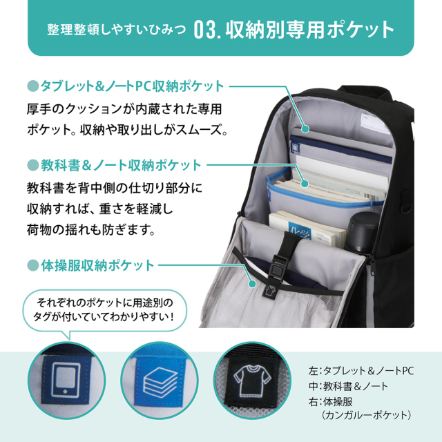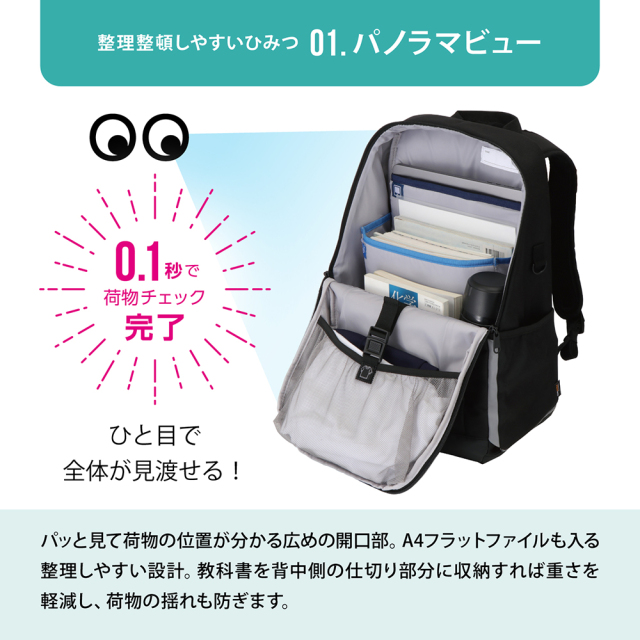 収納しやすい、整理しやすい、取り出しやすい通学カバン