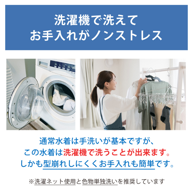 ポリエステル100%の素材を採用しています。プール内の塩素に弱いと言われているポリウレタン糸を使用していない為塩素による劣化を遅らせることが可能になります。お腹のめくれを防止するスナップボタン付き。 |