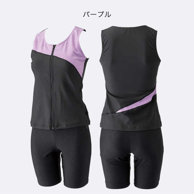 シンプルな無地セパレーツ水着。お腹のめくれを防止するスナップボタン付き。 |