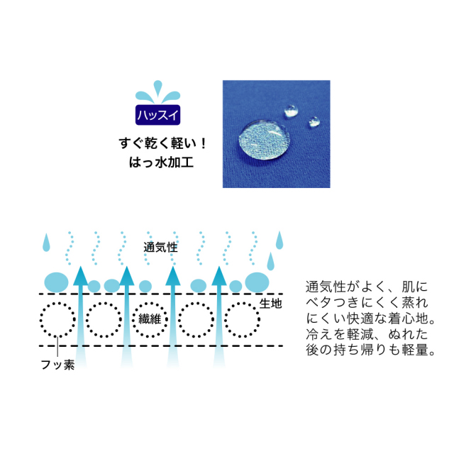 撥水加工により通気性がよく、肌にベタつきにくく、蒸れにくい快適な着心地。 |