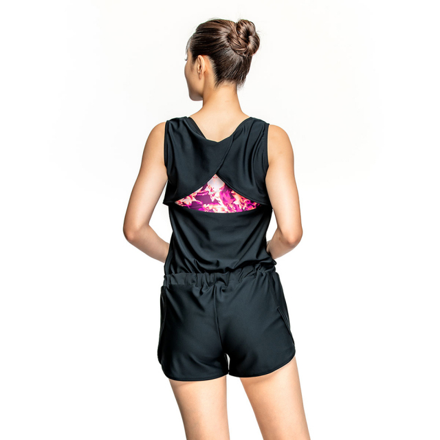 レジャーにもちょっとしたトレーニングにもおすすめの水着。トップスはフィット感のよいブラトップが付属しており、見た目はリラックスシルエットを保ちつつ運動しやすさをプラス。ボトムスは「2in1」パンツ仕様でピタッとせず、ふんわりした着心地。ブラカップ付属。ボトムスは裏地付き、無地タイプは股6.5cm(Mサイズ)。