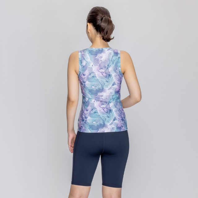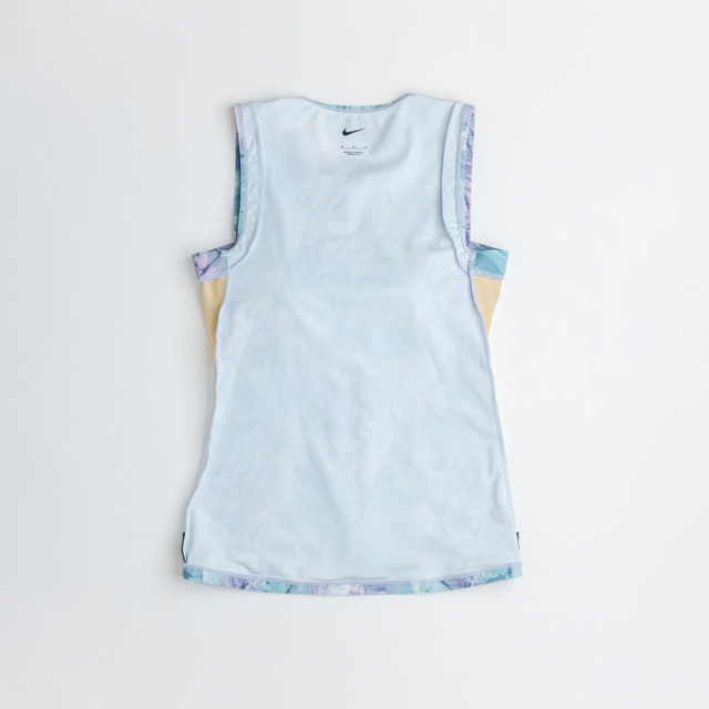 | 柔らかな色合いの華やかなプリントが顔まわりを明るく見せてくれるNikeの総柄水着。脇周りをスッキリ見せる、「ハミ肉防止」の仕様。トップスはジッパー付きで着脱が簡単、めくれ防止のスナップボタンでトップスとボトムスが留められる仕様。ブラカップ付属。ボトムスは裏地付き、長めの股下19.5cm(Mサイズ)。 |