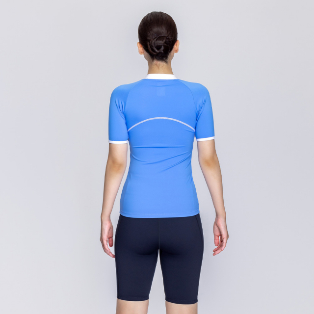 | これから水泳をはじめる方におすすめ、セパレートタイプのフィットネス水着。白い襟がアクセントのスポーティなデザイン。袖が腕周りをすっきりカバー。トップスはジッパー付きで着脱が簡単、めくれ防止のスナップボタンでトップスとボトムスが留められる仕様。ブラカップ付属。ボトムスは裏地付き、長めの股下19.5cm(Mサイズ)。 |