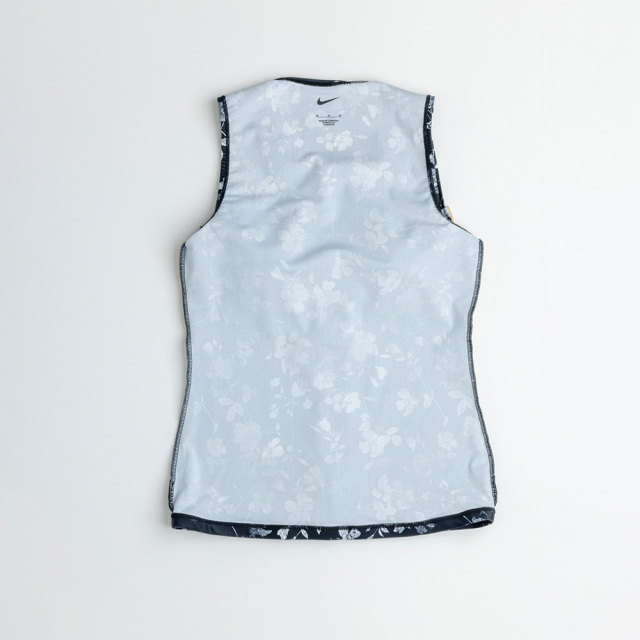 | シックな花柄のプリントが洗練された印象を与えるNikeの総柄水着。トップスはジッパー付きで着脱が簡単、めくれ防止のスナップボタンでトップスとボトムスが留められる仕様。ブラカップ付属。ボトムスは裏地付き、長めの股下19.5cm(Mサイズ)。 |