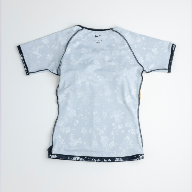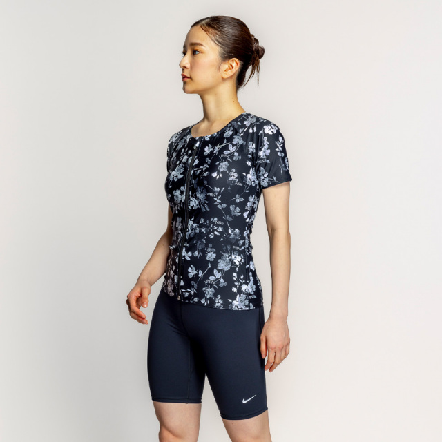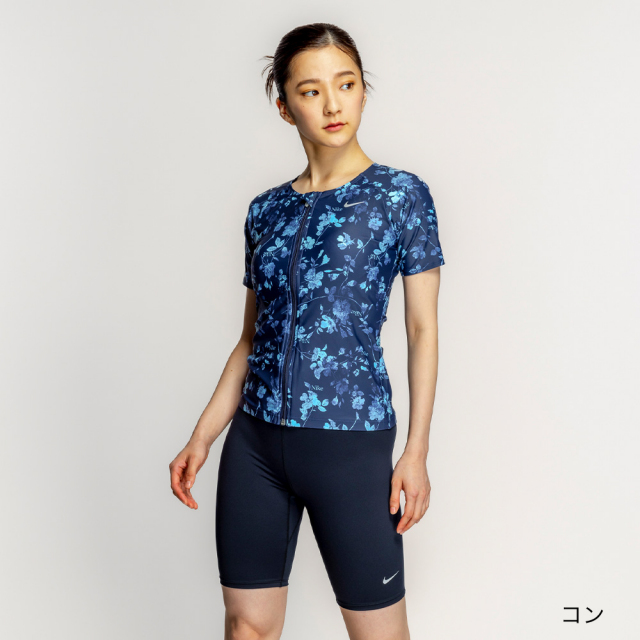 | シックな花柄のプリントが洗練された印象を与えるNikeの総柄水着。袖が腕周りをすっきりカバー。トップスはジッパー付きで着脱が簡単、めくれ防止のスナップボタンでトップスとボトムスが留められる仕様。ブラカップ付属。ボトムスは裏地付き、長めの股下19.5cm(Mサイズ)。 |