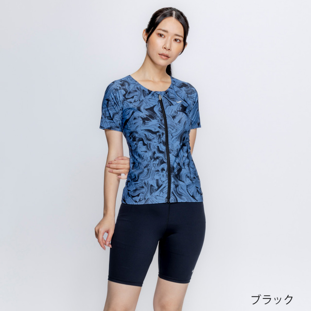 ブラシの跡をモチーフにした、モダンでシックなNikeの総柄水着。 袖が腕周りをすっきりカバー。トップスはジッパー付きで着脱が簡単、めくれ防止のスナップボタンでトップスとボトムスが留められる仕様。 ブラカップ付属。ボトムスは裏地付き、長めの股下19.5cm(Mサイズ)。