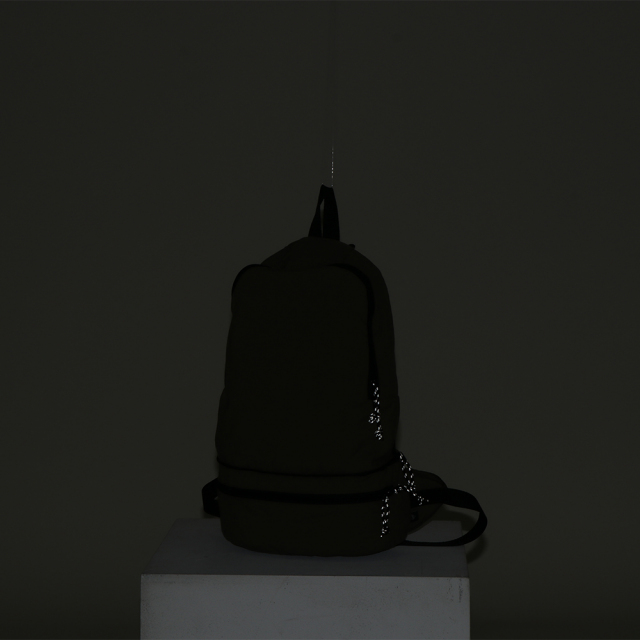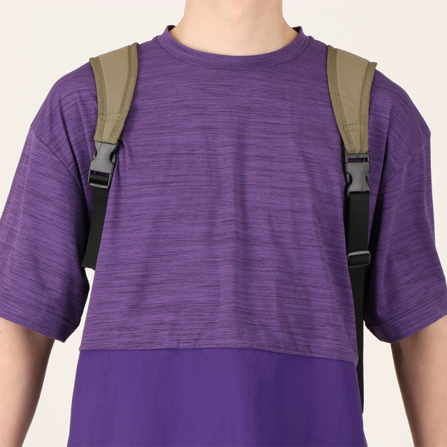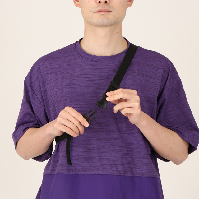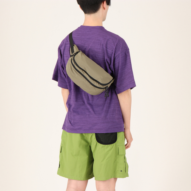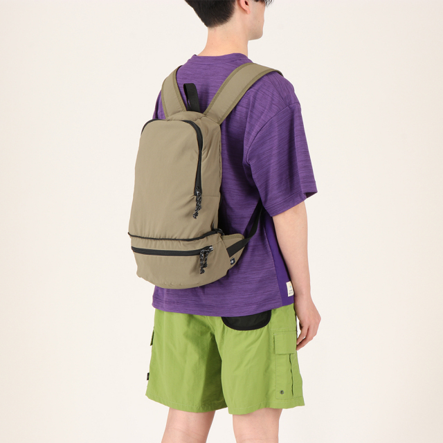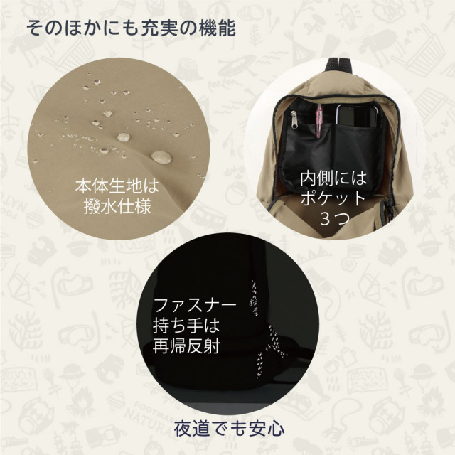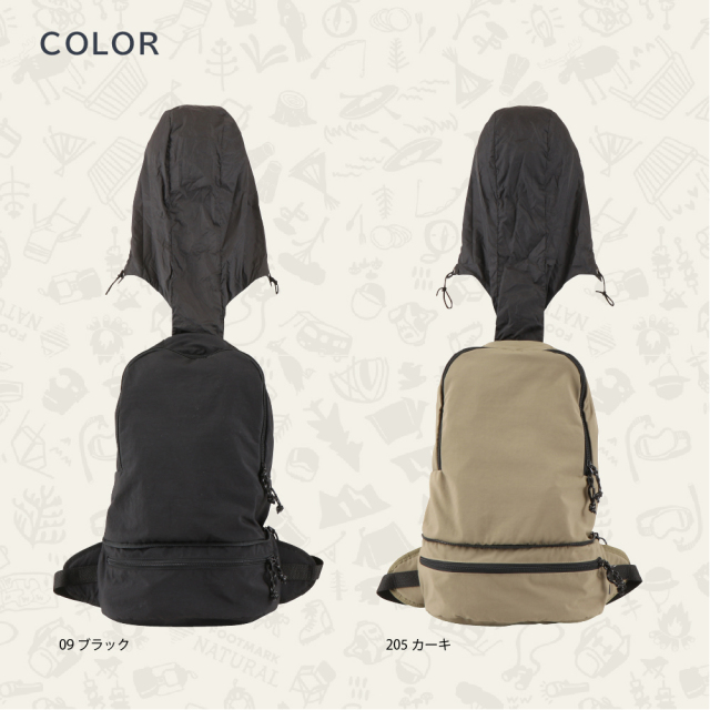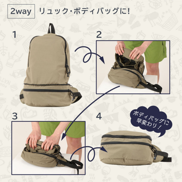 リュック上部を丸めてファスナーを閉じ、バックルを付け替えるとボディバッグに変わる2WAYタイプ。本体は撥水生地を使用し、収納できる防水フード付きで雨の日にも活躍。内側には小物が入るファスナー付きポケット1つ、パッチポケット2つ付き。ファスナー持ち手は再帰反射で夜道でも安心です。