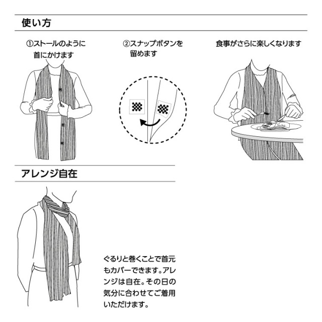 | 特長 | Table withはただ食事汚れをガードするだけでなく、お洒落と食事を楽しむために開発されたエプロンです。 外食・会食・冠婚葬祭・旅行など幅広い食事シーンでご使用いただけます。 |