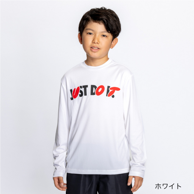 ポップなJUST DO ITが楽しい長袖キッズハイドロガード。適度にゆとりのあるフィット感で、速乾性に優れたDri-FIT素材で快適な着心地。UPF40+で日焼け対策にもおすすめ。
